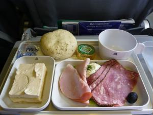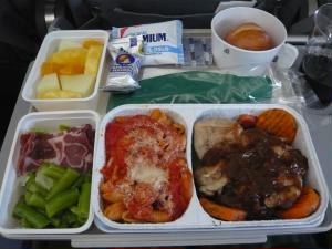 お昼ご飯です。生ハムもおいしい!そしていつものパルミジャーノレッジャーノチーズ♪♪♪ 左下:レジャーノをナイフで削って、ショートパスタや鶏肉の煮込みにかけます(^p^) 右下:映画を3本観たら、もう到着前の食事が。 |