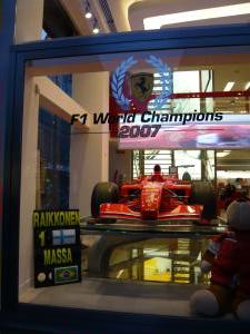 小腹が空いたため、夕飯を探しにちょっとお散歩。 フェラーリやさんに、昨年のF1カーがありました。 私はライコネンファン♪ライコネンの車と優勝カップに感激。 |