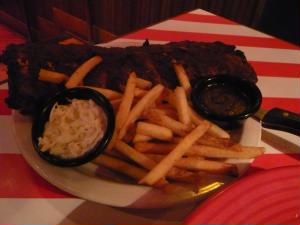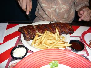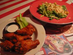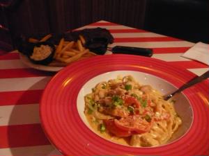 夕飯はまたしてもTGIフライデーズ。 成田空港のJCBカウンターでもらったクーポン冊子に載っていたケイジャンチキン5ピースをゲット♪ オーダーはシーザーサラダ、リブステーキ、海老のフィットチーネ。 |