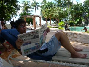 日本語の「グアム新聞」を読む旦那様。 |