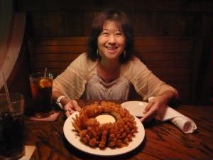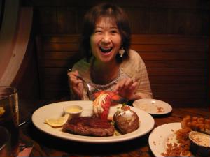 なのに、アウトバックに行ってしまいました(爆) アウトバックといえば、フライドオニオン。 旦那様はプライムステーキ。付け合せにベイクドポテト、追加料理のロブスターを私が食べることに。 やったぁ〜。ロブスター♪♪♪ |