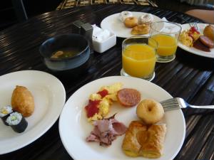 9月13日(土曜) 朝も、21階のラウンジで7〜10時に朝食が食べられます。 眺めもよくて、気持ちがいい♪ 卵料理とハム、サラミ、パン、ドーナツ、おいなりさん、海苔巻き。味噌汁とジュース&コーヒーです。 美味しい(^^) |