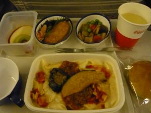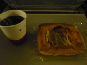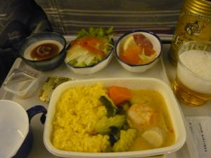 13:50発 AZ7789便ローマ行き そしてお約束の機内食。 左:もう、スプマンテはなくなってしまったので、恵比寿ビールで乾杯! 左下:夜食の菓子パン 右下:到着前のペンネのグラタン♪ |