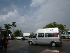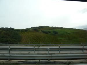 左:3泊したクリスタルパレスホテルです。 左下:今回、移動はすべて専用車。運転手さんを除くと9人乗れるバンです。参加者7名と添乗してくださる桃井さんで8名なので、ちょうどいいでサイズです。 右下:オリーブ畑やぶどう畑の中、2時間ほど走ってマルサラ酒のワイナリーに行きます。 |