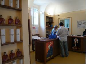 シチリアの石で作った貯蔵庫とセメントでつくった貯蔵庫があります。 左は、セメントで作られたほう。湿度の調整ができないセメントでは天井近くにかびが生えてました。 天然の石って偉いんですね〜。 左下:マルサラ酒の製造工程の説明用ボード 右下:フローリオ社の昔のボトルを展示してあるミュージアム |