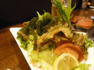 海ぶどうのサラダにはゴーヤを素揚げしたものが入り、美味しい!!! ああ♪沖縄料理、最高だわ〜(^^)v |