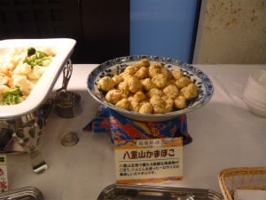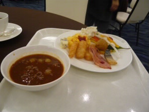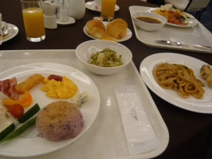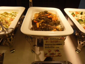2月12日(金曜日) あっという間に次の日です。 朝食付きのプランだったので、モーニングビュッフェです。 かなりおかずの種類も多く、沖縄料理もたくさん! 左下:クーブイリチー(クーブとは昆布のことだそうです) 右下:ゴーヤチャンプルー! |