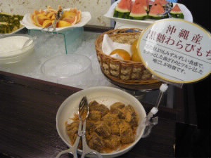デザートはフルーツとヨーグルト。 そして、沖縄産黒糖わらびもち! これ、美味しい♪♪♪ |