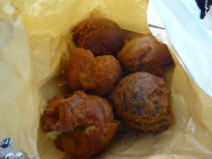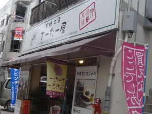 左:玉座です。 そして、那覇インターチェンジから高速道路に乗るのですが、その前に「黒糖工房 さーたー屋」さんでごまのペーストと黒糖の蜜、サーターアンダギーを購入。 タビンチュネットで「1000円以上購入してサーターアンダギー1個プレゼント」クーポンをゲットしておいたので、購入は4個(^^)v プレーン、黒ゴマ、たんかん(沖縄のみかんのような果物)、黒糖、ばななの5種。すべて1個80円! |