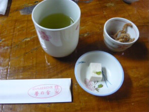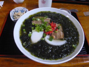 前菜に、ソーキソバを揚げたものと、お豆腐が出てきます。 左下:私はソーキソバ(お肉はスペアリブ)750円 右下:静岡出身で、青さが好きな旦那様は(だって静岡では、おでんにかけるだけでなく、お雑煮にもあおさと出汁粉を入れるんですよ・・・)、三枚肉入りアーサそば。 |