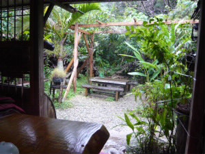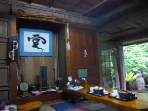 のれんをくぐるとすぐに、小さなシーサーがお出迎え♪ 左下:お庭もとても風情があります。ガジュマルの木灰を利用た昔ながらの製法の麺ということで、奥にあるのはガジュマルの木を切った物かな? 右下:1日限定30食のお店なので11時半でしたが、入りました。既に1組(3人)が食べ終わっていました。 |