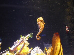 左上:伊勢海老♪美味しそう・・・(^^;;; 右上:タツノオトシゴ!シャッターチャンス♪ いいかたちだねぇ〜。 左:巨大水槽の前に到着! |