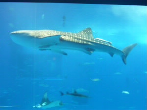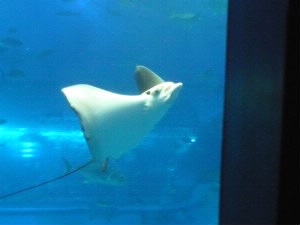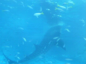 左:マンタの仲間?三角の気になる奴が。 下から見ると口とエラで「悪い顔」に見えます(笑) いろんな顔を探して笑いあいながら、ジンベイざめの給餌の時間を待ちます。 左下:ごはんだよ〜。 おお!垂直になっている!が、食べる勢いがすごくて水槽の中が大騒ぎになってました。(笑) 右下:さいごにジンベイと(^^) |