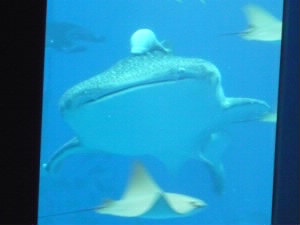 左:マンタ!ばっさばっさ、泳いできます(笑) 左下:ジンベイ!!!会いたかったよ〜♪ 右下:ジンベイ鮫の正面。かわいい♪ で、上に乗ってるコバンザメがちょんまげみたい(爆) |
