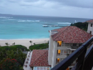 そして宿泊先のブセナテラスへ。 左下:せっかくなのでオーシャンビューのお部屋に。 右下:ベッドの奥がバスルーム&シャワーブース |