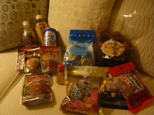 途中のスーパーで買った、本土にはない食べ物! ちんすこう、サーターアンダギー、コーレーグース、黒糖、レトルトのラフテーやハッシュコンビーフ、ランチョンミート、オリオンビールのバリエーションとさんぴん茶。 |