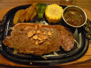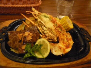 夕食はホテルの近くのステーキハウスに。 左下:私はロブスターとフィレステーキ♪ 右下:旦那様はど〜んとステーキ! |