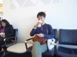 映画を4本見て、ちょっと寝ると朝食。 左:私はグラタン 左下:旦那様は卵焼きとウインナー、ポテト そしてヒューストン!私は23年ぶりのアメリカ上陸です。 2時間のトランジット。 いったん外に出てたばこを吸い、生き返って、空港内に戻りスターバックスのコーヒーを飲む旦那様。 |