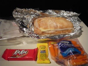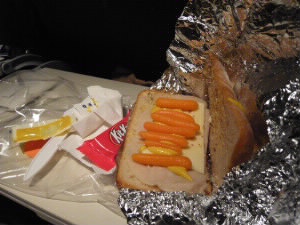 そして、15:50 コンチネンタル航空6975便でリマへ! (所要時間6時間35分) 左:夕食です。うん・・・まぁまぁだね(^^;; 左下:夜食はなんと!サンドイッチにキャロット、マスタードつき。ハムとチーズは挟んであり、好みでキャロットとマスタードをトッピング。なんともおおざっぱ! |