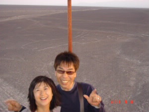 これが地上絵!! 左:約20mの高さからの「手」 左下:「木」 もうすぐ日が暮れます。 右下:真中あたりにちらっと写っているのは、セスナ機。 明日はセスナで地上絵を鑑賞!。 |