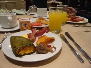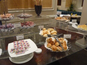 2011年4月29日(金曜日) 左:ホテルの部屋からの景色です。隣にショッピングセンターがあるみたい。 シェラトンの朝食は、おかずもたくさん! |