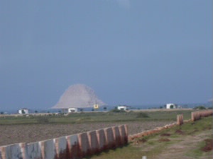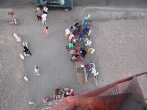 左:海が見えてきました! 左下:ナスカのあるイカ県は海沿いにあり、このあたりは海水浴場になってます。 右下:途中のドライブインでトイレ休憩。 このツアーの男性陣です。 |