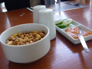 ランチです! 左:CASA ANDINAというホテルのレストラン。 左下:おつまみ(?)のジャイアントコーン(大きいとうものこし)を炒ったもの。温かくて、塩味が効き、おいしい!! 右下:ペルーで有名なインカコーラ。コカコーラの味とは全く違います。この黄色は着色ではなく、インカコーラに使っている地元のハーブの色だそうです。 |