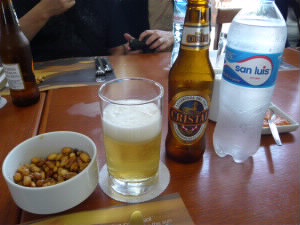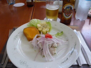左:ペルーのビールCRISTA 左下:ペルーの名物料理“セビーチェ” セビーチェは、生または軽くゆでた魚介類とたまねぎ・トマトなどの野菜を、ライムやレモン果汁・塩・種々の香辛料などで和え、そのまま漬け込んで冷やし、味をなじませたもの。付け合わせのインカのポテトの存在感が大! 右下:魚介類のリゾット |