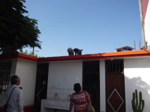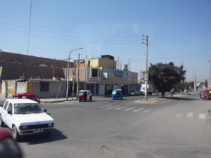 左:郊外の街中では、三輪自動車をよく見かけました。 イタリアのAPEみたいです。 なんと、ペルーではこれがタクシーです。 左下:ICA県に入ります 右下:途中のドライブインでトイレ休憩。なんと、売店の屋根の上に犬小屋があり、ワンコが(^^) |
