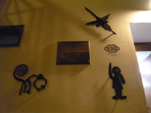 左:S&Pが立たないの!面白い。 左下:レストランの壁にマリア・ライヘ女史の写真と地上絵のオブジェが。 右下:130室。ここがマリア・ライヘ女史が住んでいた部屋です。 |