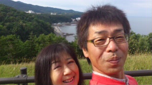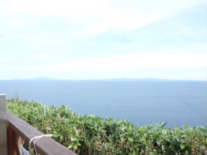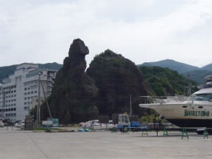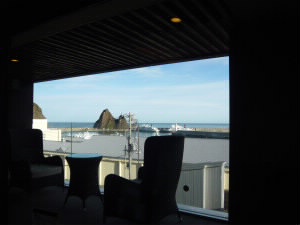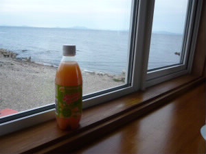 宿泊していたウトロに一度戻り、ゴジラ岩を眺めながらコーヒーブレイク。 |