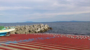 テトラポットの上、1個1個それぞれに、ウミネコ。 すんごい量なの! 左下:本日の宿は「羅臼の宿 まるみ」 http://shiretoko-rausu.com/ 右下:夕張メロンソーダ! |