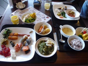 朝食も昨夜と同じテラスダイニング。 ガラスの向こうにテラス席もありますが、9月はもう寒くて無理・・・ですね。 今日も、オホーツク海がとても綺麗です。 |
