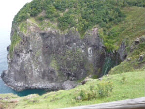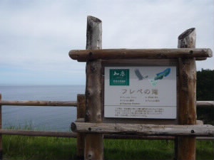 次はフレぺの滝です。 海側から遊覧船で見ることもできますが、今回は知床自然センターから20分ほど歩いて、陸側の滝を見に行きます。 この滝には川がなく知床連山に降った雪と雨が地下に浸透し、垂直に切り立った約100mの断崖の割れ目から流れ落ちています。 ホロホロと流れ落ちるさまが涙に似ていることから、地元では「乙女の涙」という愛称で親しまれています。 |