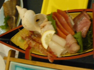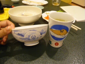 食器がオリジナルです。ちょっとかわいい♪ この宿からホエールウォッチングの船も出ているようです。時間があったら行きたかったな〜。 |