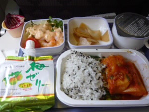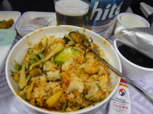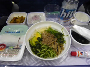 KE137便 仁川19:25発 左:旦那様は洋食・・・? 左下:私はKE名物の「ビビンパ!」 まず、左にあるパックのご飯を中央の野菜の上に乗せます。 右下:チューブのコチジャンをかけて混ぜます!さらにごま油をかけてできあがり! |