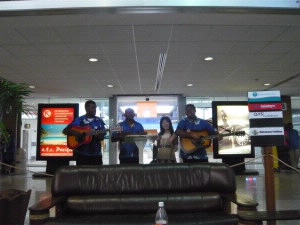 4月30日(金曜日) 左:朝ごはん〜。 左下:ナンディ空港に8:35着 右下:歓迎の歌を歌う楽団メンバーと一緒に。 |