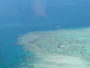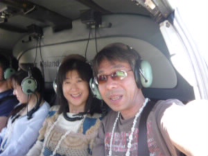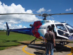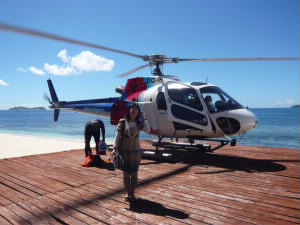 今回宿泊するマタマノアリゾートへの船便は1日に2本。 8時の便の次は夕方。それではせっかくの離島滞在時間が短くなってしまうので、ヘリで行く手配をしてありました。 船では2時間かかりますが、 ヘリでは10分なのです(^^)v トコリキ島へ行く日本人1組と、同じマタマノアに行く日本人1組と私たち6人が乗りました。 11時発。 水上飛行機はケアンズで乗りましたが、ヘリは初体験! 音が・・・すごいのでヘッドフォンをします。 |