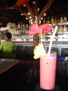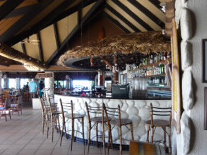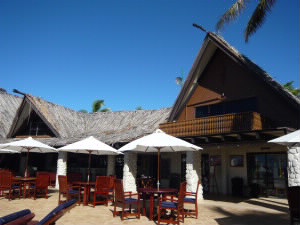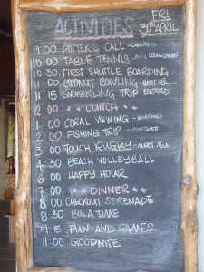 レセプションの左がバー。 ここでウエルカムドリンクを飲みながらチェックイン。 歓迎の歌を楽団(3人)が歌ってくれました。 マタマノアリゾートは客室が全33室。ゲストの人数も少ないし、12才未満は泊まれないので、子供が居なく、とっても静か!! 右下:毎日、レセプションのところに、本日のアクティビティの時間が書いてあります。 |