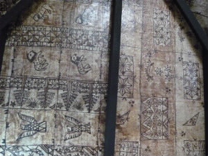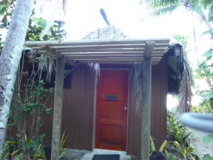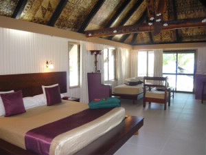 左:一番へリポートに近い1番のコテージが3泊する我が家です。 左下:大きなベッドと奥にカウチ、右奥にはバーカウンターがあり、冷蔵庫やコーヒーメーカーがあります。 右下:天井は叩きなめした木の皮に描かれた独特の芸術「タパクロス」。なんだか可愛い。 |