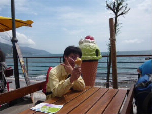 教会巡りに疲れたら、ジェラート! ゴミ箱もアイス型(笑) 海を眺めながら、気持ちいい〜。 |