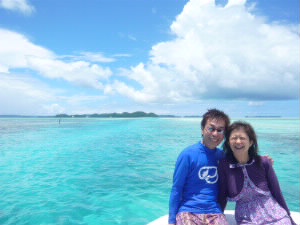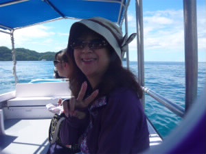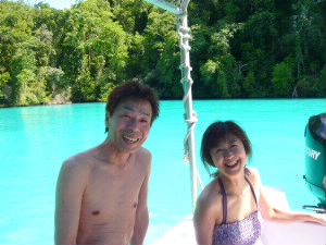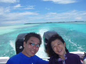 左:いい天気!気分爽快♪ 左下:ボートのスピードが速過ぎて、髪の毛が〜〜〜。 右下:ランチは無人島でお弁当。 |
