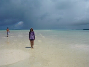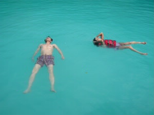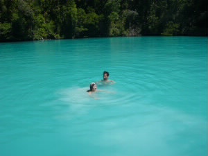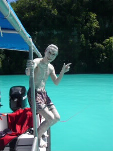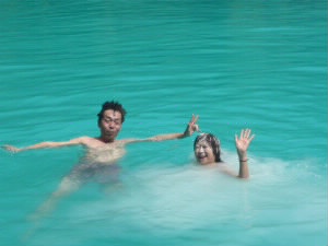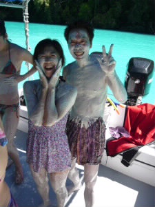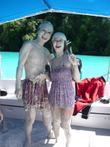 海をもぐって、添乗員さんがミネラルたっぷりの泥をすくって来てくれます。それを体に塗り塗り。 左下:全身に塗りまくり!え?もっと?? 右下:ってことで、髪まで真っ白! そして泥が乾いたら、海に飛び込んでおとします。 髪も充分に洗いますよ。 |
