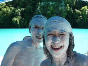 今回の旅はチケットの手配をSTワールドさんにお願いしました。3年前、フィジーに行ったときにとても丁寧な対応だったので。そこで、オプショナルツアーを申し込んでおきました。 私たちと、3人組のOLさん、夫婦1組の7人のツアーです。 まずは、ミルキーウェイで泥パック! |