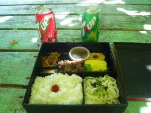 おお!日の丸弁当&うどん。 7upのチェリー味・・・甘い。 お弁当を食べているとどんどん潮が引いていき、ず〜っと歩いて行けます。 |