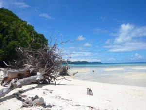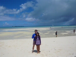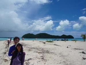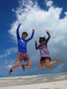 うしろは「おじさん島」。おじさんが仰向けで寝てる姿みたいだからだそうです。 左下:イエイ! 右下:結構潮がひいたよ〜 |