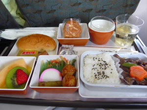 右下:そして和食をチョイス。山菜きんぴら、紅白蒲鉾、つくね、蕗土佐煮、牛すき煮、デザートはフルーツと人形焼♪