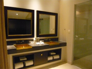 バスタブの正面は洗面台。バスタブの横にガラス張りのシャワーブース。反対側はトイレ。トイレはさすがにくもりガラスですw