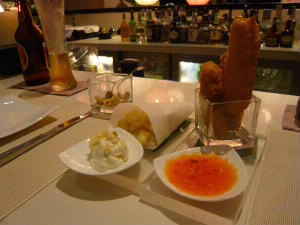 春巻きはチリソースを、カラマリはサワークリームを付けて食べます。 |
