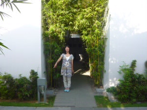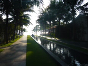 左:両側にコテージが並ぶ長い池(?)の向こうに、プール、ビーチと続きます。